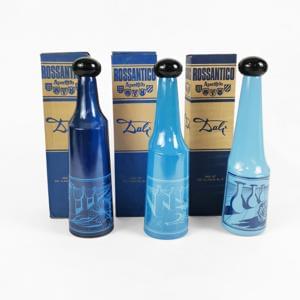 Trois bouteilles, verre teinté bleu à décor de paysage surréalis...