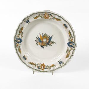 4309. Plat à bord chantourné, à décor aux drapeaux, Moustier, XVIIIe s