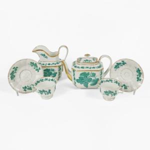 Porcelaine, comprenant: 6 assiettes, 10 tasses, théière, sucrier