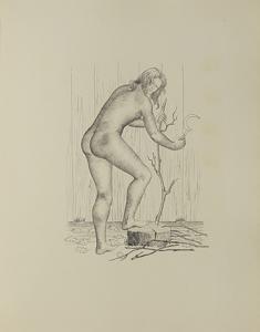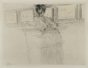 Femme de dos examinant des tableaux, pointe sèche, signée à la m...