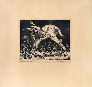 L'âne, bois gravé, signature illisible, 14x16 ccm
