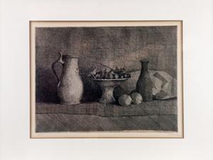 Nature morte au pichet et à la coupe de fruits, eau-forte, signé...