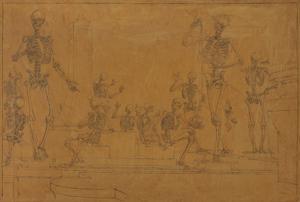 Etudes de squelettes dans diverses postures, plume sur papier, 3...