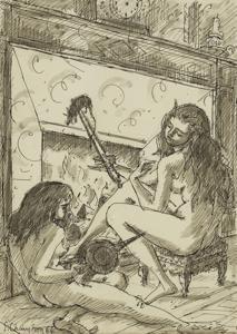 Deux femmes conversant près de la rivière, pastel et craie grass...