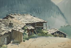 Plan Cerisier, Valais, aquarelle sur papier, signée, 31,5x46 cm