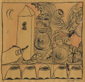 Un rêve mégalomane, encre et aquarelle, daté 1980, 10x10 cm