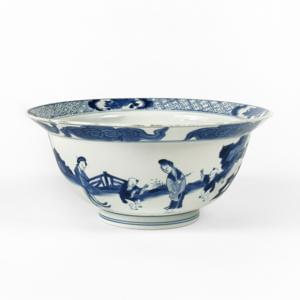 Porcelaine émaillée bleu et blanc à décor d'un paysage animé, D...