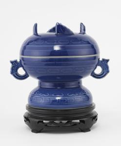 Céramique émaillée bleu taché de pourpre, support en bois sculpt...