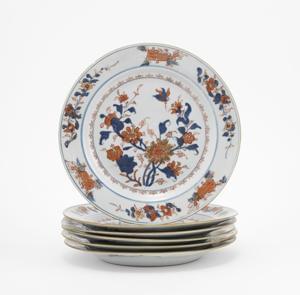4900. Suite de six assiettes, Imari, Chine, Compagnie des Indes, XVIII...