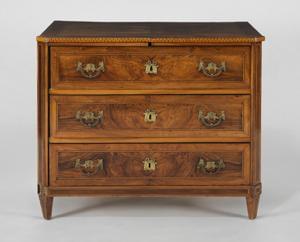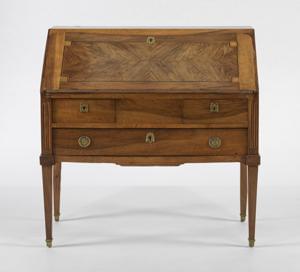Trois tiroirs, un abattant, noyer et filets de bois clair et fon...