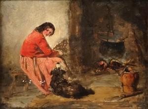 Jeune femme et chien dans un intérieur, huile sur panneau, 13x17...
