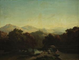 Scène pastorale devant des ruines de château, huile sur toile, 3...