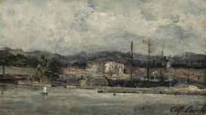 Scène portuaire, huile sur toile, signée, 46x55 cm