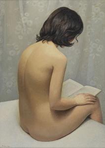 Femme dénudée au livre, huile sur toile, signée, 90x65 cm