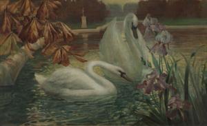 Les cygnes, huile sur toile, signée, 114x70 cm