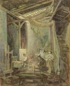 La cabine d’essayage du théâtre, huile sur toile, signée et daté...