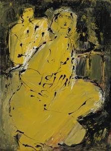 Le couple jaune sur fond noir, huile sur panneau, signée et daté...