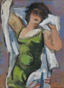 Femme à la robe verte, huile sur papier, signée et monogrammée,...
