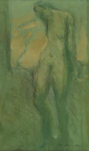 Grand nu vert, huile sur panneau, signée et datée 1991, 61x39 cm