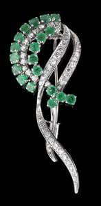 3304. *Broche à motif de volutes serties d'émeraudes (env. 3 ct) et de...