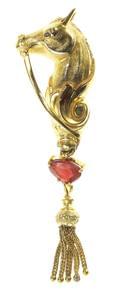 3310. *Broche à motif de buste de cheval surmontant un saphir orange (...