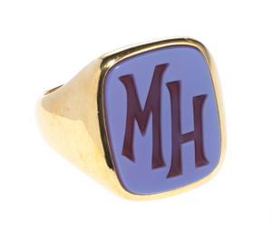 3315. Chevalière sertie d'une plaque de calcédoine monogrammée MH