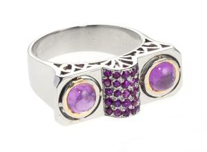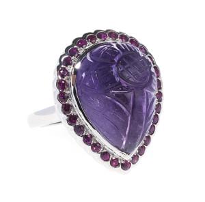 3364. Bague sertie d'une améthyste taille cabochon poire gravée à moti...