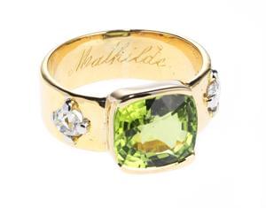 3329. *Bague sertie d'un péridot taille coussin (env. 4 ct) épaulé de...