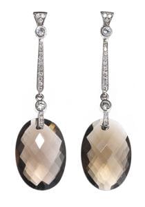 3336. *Pendants d'oreilles retenant chacun un quartz fumé taille ovale...