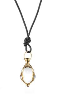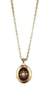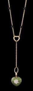 3388. Sautoir émaillé vert retenant un pendentif porte-photo et un pen...