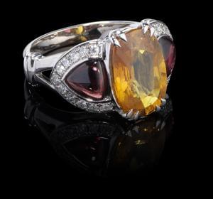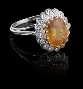 3359. *Bague sertie d'un saphir jaune du Siam taille ovale (4,97 ct) e...