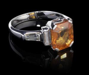 3360. *Bague sertie d'un saphir jaune orangé du Siam (3,66 ct) épaulé...