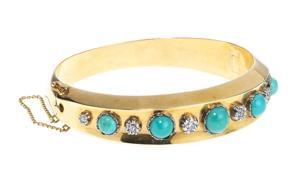 3386. Bracelet jonc ouvrant serti de turquoises taille cabochon altern...