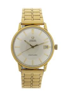 Cadran doré, aiguilles noires, index bâtons dorés, date à guiche...