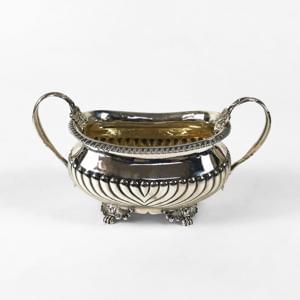 3706. Sucrier quadripode à décor repoussé de godrons torses et anses p...