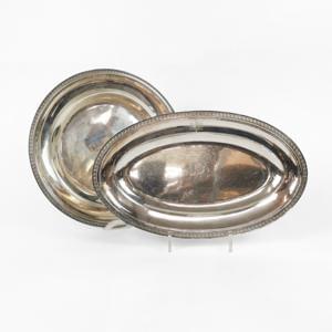 3714. Un plat rond et un plat ovale à bordure de feuilles d'eau et gra...