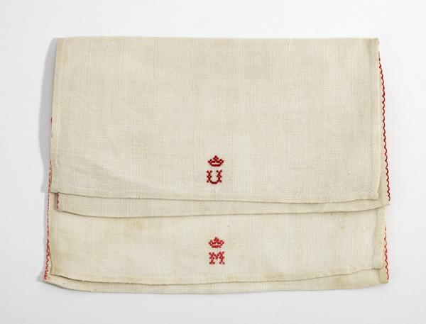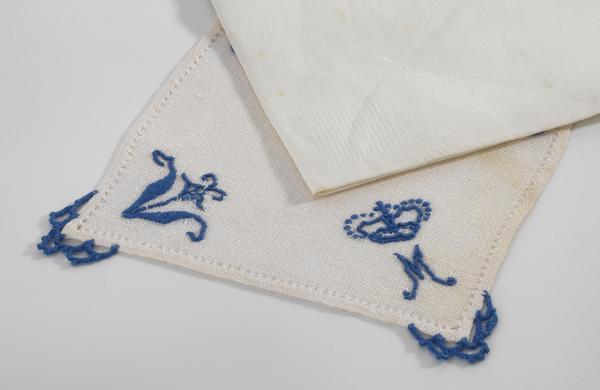 4111. Deux serviettes brodées aux chiffres de la reine Marguerite de S...