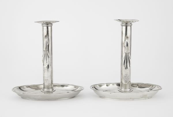 4172. Paire de chandeliers ménagère à crémaillère, l'un armorié