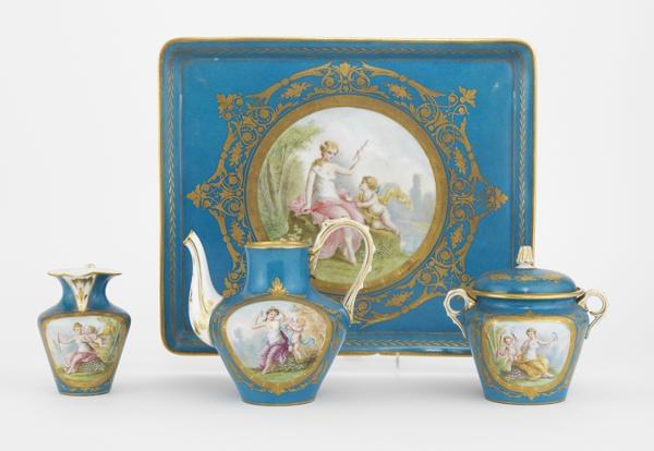 4525. Cabaret à décor bleu azur et or, déesses et amour en réserve