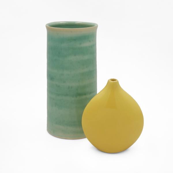 4530. Deux vases , l'un tubulaire céladon, l'autre goute jaune
