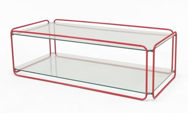 Structure en métal tubulaire laquée rouge et verres quadrillés,...