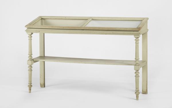 Bois laqué rouge, verre, 30x79x54 cm. Provenance : collection Ma...