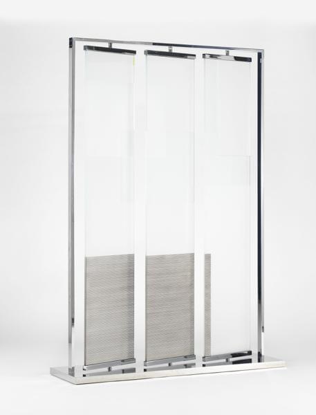 Verre sablé, montant en acier chromé, 211x150x40 cm