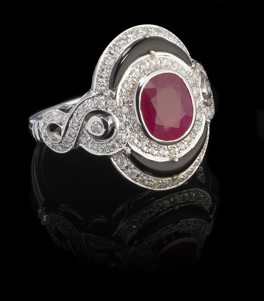 Centrée d'un rubis taille ovale (env. 1,4 ct) entouré de diamant...