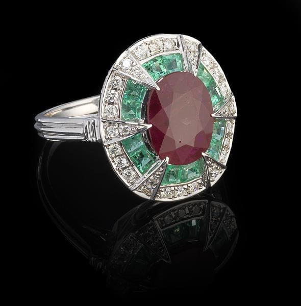 Dans une monture ajourée et entouré de diamants et de rubis, or...