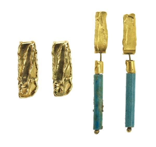 L'une retenant des motifs en céramique turquoise, or 750, H 5,5...