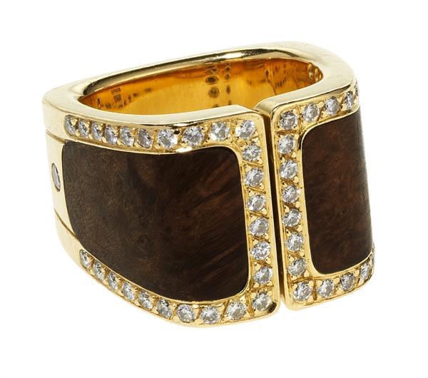 3456. Bague design sertie de bois exotique souligné de lignes de diama...