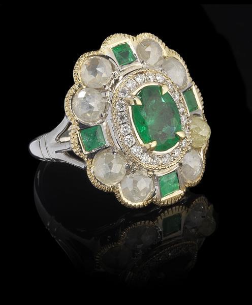 3409. Bague marguerite centrée d'une émeraude taille ovale (env. 1 ct)