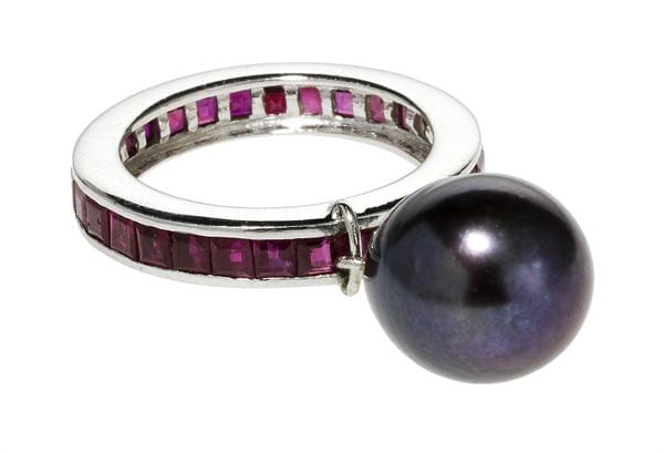 Serti de rubis calibrés et rehaussé d'une perle violet-gris en g...