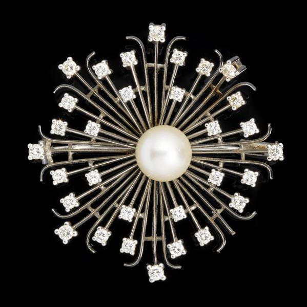 Centré d'une perle (D env. 5,5 mm), pavé et réhaussé de diamants...